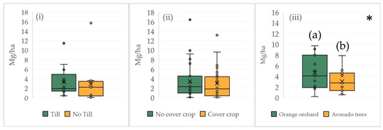 Mean soil erosion (Mg/ha) in (i) tilled and non-tilled plot at the olive orchard site during the 2.5-year of monitoring, (ii) no vetch and vetch plot at the vineyard site during the 2.5-year of monitoring, and (iii) orange and avocado plot at the fruit orchard field during the 3-year monitoring (* denotes significant differences at a 90% CI level).