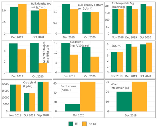 Topsoil bulk density was slightly higher in the no-till plot. Bottom soil bulk density was found at the same levels in both plots. Exchangeable magnesium had an increasing trend in both plots from 2018 to 2020. Mineral nitrogen and available phosphorus concentrations were lower in the no-till plots, both in 2019 and 2020. The soil organic carbon rate had an increasing trend in both plots from 2018 to 2020, and was slightly higher at the last year, which was probably due to the animal manure application. The crop yield was the same at both plots (till and no-till) and was increased in 2020 compared to the years 2018 and 2019. Earthworms’ density per m2, which can be used as a sensitive indicator to management changes were substantially higher in the non-tilled plot compared to the tilled one in the 2020 measurement, indicating better soil health and condition. Weed infestation was slightly higher (10%) in the non-tilled plot compared to the tilled one, which cannot be assumed as a considerable high hazard.