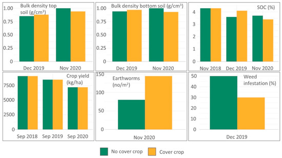 By the end of 2020, top- and bottom soil bulk densities of the vetch plot were lower compared to the no vetch plot, indicating good soil functioning, improved water and solute movement as well as soil aeration. A soil aggregate stability test resulted in good soil stability and resistance to erosion for both plots; however, for the vetch applied plot, slaking effect was slightly less observed, indicating better structure maintenance. The soil organic carbon did not follow a specific trend; it was relatively satisfactory around 4% in both plots (control and SICS) from 2018 to 2020. The crop yield was the same at both plots (control and SICS), having a slightly decreasing trend during the 3-year monitoring. Earthworms per m2, which is a soil health indicator, were considerably higher in the vineyard with the cover crop applied. The percentage of weed infestation was 20% less in the vineyard with the cover crop.