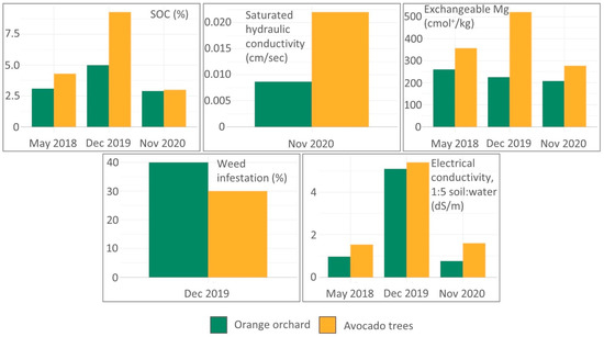 The soil organic carbon rate was higher in the avocado trees compared to the orange orchards. The saturated hydraulic conductivity was considerably higher in the avocado trees plot compared to the orange trees plot, in the 2020 measurement. The exchangeable magnesium was also higher in the avocado trees compared to the orange orchards during the 3-year monitoring. The level of weed infestation was 10% less in the avocado field compared to the orange trees field. Electric conductivity values indicated high salinity levels in both plots, while higher values were observed for avocado trees.