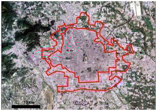 Satellite image of Beijing in 2006 (Source: Google). The red line indicates the first green belt in Beijing as planned in the 1993 master plan.