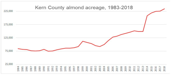 The analysis is for Kern County, California, which has an area of 1 million acres overlying usable groundwater and agricultural production limited to 0.9 million acres [24,25]. This region has access to high-quality surface water imports from a variety of sources, but groundwater also represents a significant source of supply to agricultural production. Kern County is a major producer of fruit and nut crops, among which crop area devoted to almonds has increased significantly over the last 20 years, concurrently with almond prices, and particularly since 2013 (Figure 1).