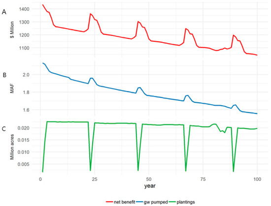 Baseline scenario. (A) annual net benefits, (B) groundwater pumped, and (C) perennial plantings.