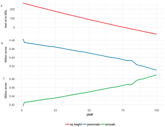 Baseline scenario, where the rows (from top) are the (A) aquifer level, (B) perennial area, and (C) annual area.
