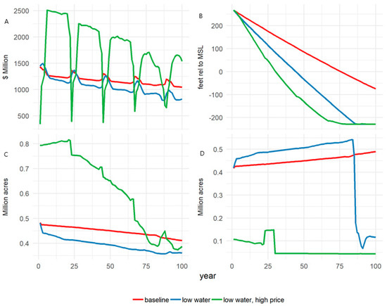 While no one knows precisely how climate change coupled with drought will impact future water supply availability for irrigated agriculture, agricultural regions in California, and likely throughout the world, likely will need to reduce water use to bring their basins into balance [32]. In this section, we investigate the impact of a permanent surface water reduction with and without a corresponding change in perennial prices for a 100-year horizon (referred to as “low water” and “low water, high price”, respectively). The reduction in surface water is assumed to be 25% relative to the baseline for a total annual supply of approximately 1.48 MAF. The perennial price increase is assumed to be 25%, for approximately USD 3.16 per pound.