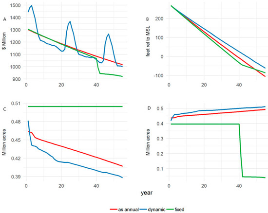 Figure 4 depicts key time series for the “low water” and “low water, high price” scenarios. The corresponding results from the baseline scenario are also included for comparison. The annual net benefits in the “low water” and “low water, high price” scenarios are lower and higher than the baseline, respectively (USDM 1059 and USDM 1804 vs. USDM 1173). Perennial area in the “low water” scenario is about 40,000 acres lower than the baseline (396,000 vs. 436,000 acres) and approximately 219,000 acres (635,000) higher in the “low water, high price” scenario. Whereas the decline in perennial area in the “low water” scenario is rather muted, the change in the “low water, high price’ scenario is dramatic, falling by more than half (400,000 acres) over the 100-year time horizon. The apparent implication is that surface water reductions eventually lead to a decrease in perennial area, but a higher perennial price provides a strong incentive to start at a much higher level of perennial production. While annual crop area increases over time in the “low water” scenario over much of the time horizon, it eventually collapses due to high pumping costs. In contrast, annual crops are almost crowded out by perennials in the “low water, high price” scenario, with a spike in annual area occurring around year 25 as much of the perennial area is removed. Beyond that, the relatively high profitability of perennials and high pumping costs lead annual crop area to be drawn down to almost nothing by the end of the horizon. Both water reduction scenarios dramatically draw down the aquifer relative to the baseline, with each almost de-watering the aquifer at a height of −229 below MSL as compared to −12 feet in the baseline. The difference between the two water reduction scenarios is that the “low water, high price” scenario follows a steeper descent, dropping below −200 feet by approximately year 64, whereas the “low water” scenario does not do so until approximately year 87, again reflecting the reliance on groundwater to irrigate the large perennial crop area. While the baseline does not experience any fallowing, the “low water” and “low water, high price” scenarios experience high levels of fallowing in the last period with 371,000 and 436,000 acres fallowed, respectively.