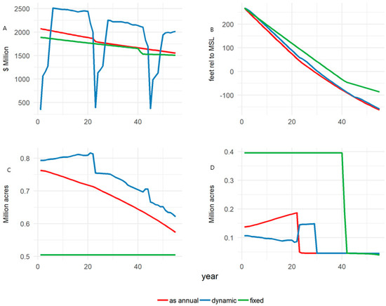 Model comparison of key series for the “low water” scenario. (A) annual net benefits, (B) aquifer height, (C) perennial area, and (D) annual area.