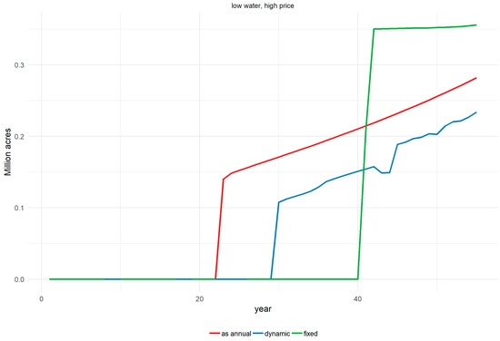The results from the “low water” scenario for each model are shown in Figure 6. Similar to the results from the baseline scenario, the “dynamic” model displays slightly higher median annual net benefits (approximately USDM 1145, 1136, and 1163 for “as annual”, “fixed”, and “dynamic” models, respectively) and less draw-down of the aquifer (heights of approximately 74, 58, and 96 feet relative to MSL for “as annual”, “fixed”, and “dynamic” models, respectively). While the “as annual” and “dynamic” models show similar trends of substituting annual crops for perennials over time, they are reversed relative to the baseline scenario in that the “dynamic” model is more aggressive about replacing perennials, whereas in the baseline, the opposite is true. The “fixed” model holds annual crop area constant until year 40 when it collapses to almost zero, a pattern that is repeated in Figure 7 because the “fixed” model has no flexibility to take advantage of higher perennial prices. In contrast, the “as annual” and “dynamic” models take advantage of higher prices by dramatically increasing perennial crop area to close to 800,000 acres in the first year. Whereas the “as annual” model makes a smooth, continuous transition away from perennials over the whole time horizon, the perennial rotation dynamics results in a stable to slightly increasing trend in perennial area until after year 20 when removals of older crops result in a discrete drop in area. Perennial area continues to be drawn down over the rest of the time horizon, but changes in area continue to be bumpy due to differences in the area of different vintages. Again, in this scenario, the “dynamic” model has the highest median annual net benefits with a difference of USDM 397 and USDM 432 compared to the “as annual” and “fixed” models, respectively.