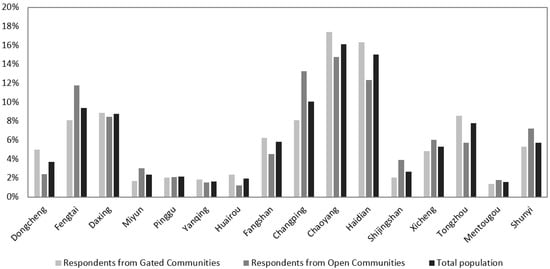 Different types of residential communities were well-represented. There were 643 survey respondents (65.9% of the sample) living in residential communities with gates and walls, and approximately 90% of them further reported that their communities have at least one type of additional access control, which include gatekeepers/security guards, automatic facial recognition, and smartcard or barcode scanning using smartphones. It is worth noting that there were important similarities between respondents from GCs and those living in open communities. As shown in columns (2) and (3) in Table 1 and Figure 1, they show very similar distributions in terms of gender, education, income, and living district, which are important for their housing choices. Notably, GCs respondents were slightly older than those in open communities, and they were more likely to be local residents and homeowners, i.e., they tend to be relatively better off. Figure 1 shows that the spatial distribution of survey respondents largely resembles the distribution of the total population in Beijing in 2020. This suggests that the online survey can largely reflect Beijing residents’ general housing preference and their perception of GCs.