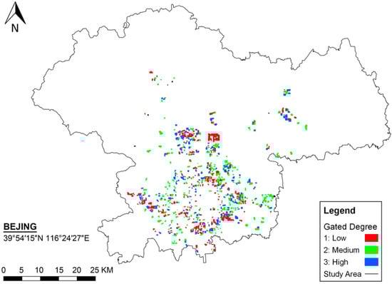 Referring to Sun [46], we identified GCs using the high-resolution aerial imagery and street views from the Chinese map services, including Baidu (map.baidu.com (accessed on 20 June 2021)), Gaode (amap.com (accessed on 20 June 2021)) and Tencent (map.qq.com (accessed on 20 June 2021)). We measured gatedness by the use of gates for pedestrians and gates for cars. It is more likely for communities with both types of gates to impose access control of outsiders (see examples in Figure A2). Specifically, we defined three categories of gatedness in the order of strictness, denoted as Gated Degree: (1) at least one of visible pedestrian or car entrances from the street view is not gated; (2) all the visible pedestrian and car entrances are gated, but some entrances do not have street views, thereby inhibiting the identification of the gates; (3) all the pedestrian and car entrances are visible and are gated. Thus, a higher Gated Degree denotes a stricter level of access control.