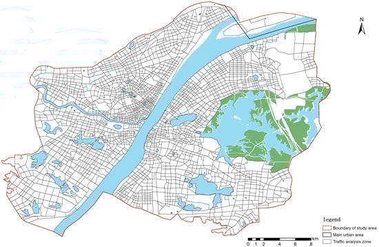The basic data included urban block data, urban road network data, urban public transportation data, and urban building data. Traffic analysis zone (TAZ) is used to define blocks. TAZs belong to the urban micro-medium level, and each TAZ has as similar characteristics as possible in terms of population density and land use. Thus, using TAZ data for block-level research has significant advantages. The TAZ data this study used are delineated based on the travel volume and road conditions in Wuhan in 2018. Owing to the northern boundary of the main urban area isolating part of the complete traffic zone, the study area near Tianxingzhou was marginally adjusted; Figure 2 shows the before-and-after comparison. We used 2395 TAZs with cellular signaling data within the study area, with an average area of 0.217 km2, and TAZs without cellular signaling data were not included in the study area [].