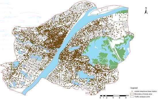 It is well established that cellular signaling data can be used effectively to study human behavior [,,]. The cellular signaling data used in this study were collected by a large mobile operator in Wuhan, whose subscribers account for 67% of all cell phone users, and the cell phone usage data it collects is highly universal and representative, reflecting the travel behavior of most people []. Cellular signaling data were collected by mobile operators from 5 March 2018 to 11 March 2018 and contained 5 working days and 2 rest days, which can fully reflect a cycle of human activity. This paper attempts to explore the relationship between block vitality and block environment in daily situations, and thus the time period chosen for the study is universal in that it does not include holidays and other major events with extremely variable pedestrian flow. A total of 150,704,053 communication records were obtained from 21,995 base stations in the main urban area of Wuhan; Figure 4 shows the locations of the base stations in the main urban area. Only time information and coordinate information were extracted from each communication record, and no sensitive information was included.