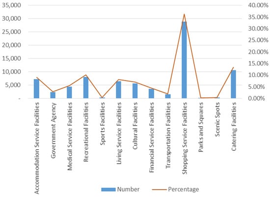 The POI data for Wuhan in 2018 were obtained from the Baidu Map by administrative region and time. We combined similar categories into 13 categories according to the official categories given, and classification is presented in Table 1. A total of 79,758 POIs within the scope were retained, and the percentage of POIs in various categories (Figure 6) and the specific spatial distribution (Figure 7) are as follows.