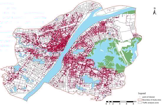 - We used POI data representing the most fine-grained land uses to measure the function density of blocks and the degree of mixed functional use of blocks []. The spatial entropy of POIs was used to quantify the degree of mixed functional utilization of the block.