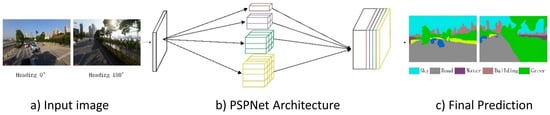 PSPNet is a novel deep convolutional neural network model that classifies each pixel of an image and divides the image into several visually meaningful regions. Reportedly, it can be used to precisely and efficiently segment street-view images and identify the percentage of greenery, sky, and other elements [,,]. The model schematic is shown in Figure 8. Based on a previous model, the model was trained using 1000 labeled images as the training set for machine learning to make the model more suitable for the research needs.