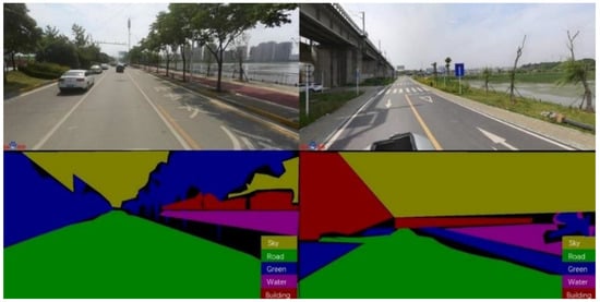 The image was segmented into five parts—building, sky, greenery, water, and road (Figure 9). The ratio of sky pixels to the total number of pixels in the image was calculated to represent the percentage of the sky in the image, and the green-looking ratio was calculated in the same way [].