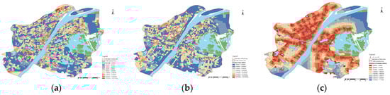 Neighborhood accessibility. (a) Road network density; (b) bus station density; (c) distance to the nearest subway station.