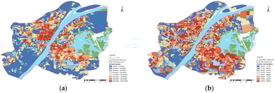 Block function comprises two components—block function density and block-function-mixing degree (Figure 11). The red color in Figure 11 represents high value. Both the function density and the functional mixing degree display the characteristics of high center and low surrounding; however, there is no apparent correlation between them. The north side where the two rivers (Yangtze and Han) meet is the area with the highest density of POIs and the densest distribution of block functions, but this part of the block has single-type points of interest, implying a low-level block mixing and a single block function.