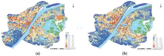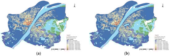 We visualized the average vitality of workdays versus weekends (Figure 18). The distribution of block vitality on workdays and weekends is closer. Compared with workdays, the distribution of block vitality on weekends is more balanced. The high-value aggregation area of Hankou’s vitality weakened significantly, and the vitality value of science, education, culture, and government office areas in Wuchang District decreased marginally over the weekends.