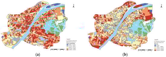 Block construction intensity comprises floor area ratio and building density. Building density is a two-dimensional perspective that uses the building coverage of a parcel to quantify the development and utilization of flat land, whereas the floor area ratio considers the vertical development level of a block from a three-dimensional perspective (Figure 12). The graphs in Figure 12 are colored from red to blue to represent gradually decreasing values.