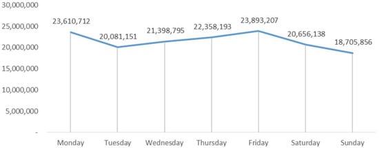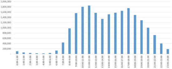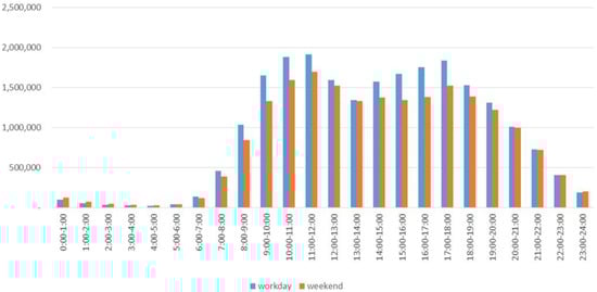 The collected cellular signaling data were organized by days and time periods (Figure 14, Figure 15 and Figure 16). Figure 14 shows the total cellular signaling data for each day of the study period. Figure 15 shows the cellular signaling data for a week averaged in 1h units as a reflection of the prevailing situation for each hour of the week. The number of cell phone users is lowest from 3:00 to 5:00 throughout the day. From 7:00 onward, the number of cell phone users starts snowballing. The number of people using cell phones reaches two peak values in a day during the dining hours of 11:00–12:00 and 17:00–18:00 but gradually decreases after 18:00. Figure 16 shows the distribution of cellular signaling data on average for workdays and weekends. Numerically, the number of people using cell phones from 23:00 to 5:00 on weekend nights is higher than that on workdays, reflecting that the city is more active on weekend nights.