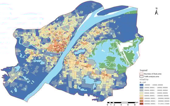 Block vitality can be expressed as the density of people performing activities in a unit spatial area. Compared with other data, the cellular signaling data can effectively reflect the real activity of people. Measuring block vitality by the distribution density of cellular signaling data has been proven to be effective [,].