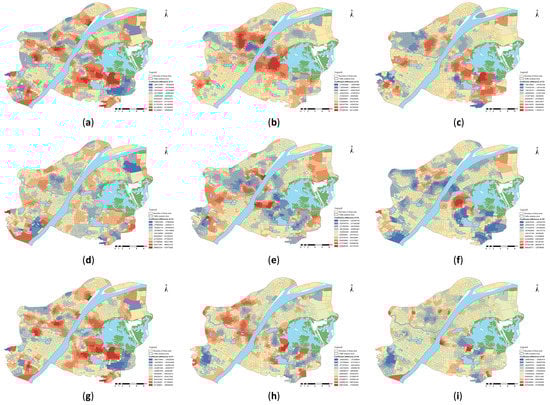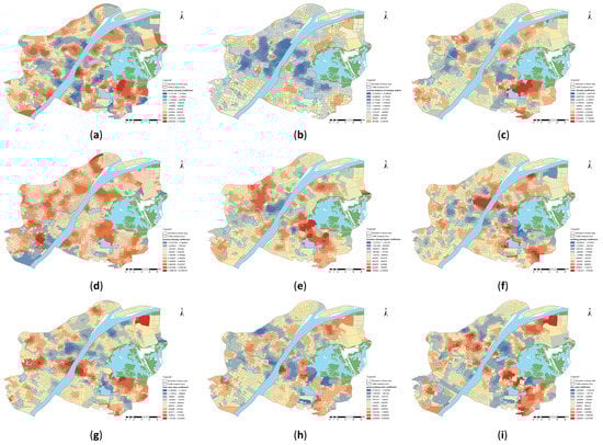 One of the differences between GWR and other regression methods is that GWR can calculate impact coefficients for each indicator in each region. We visualized the coefficients of each indicator for each block (Figure 20). The blue area in Figure 20 represents high-intensity negative impact, the red area represents high-intensity positive impact, and the yellow area is low impact; the effect of each indicator on block vitality is spatially nonhomogeneous and varies extensively.