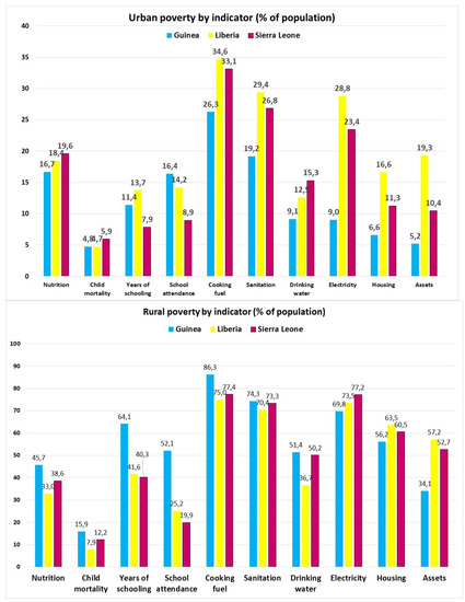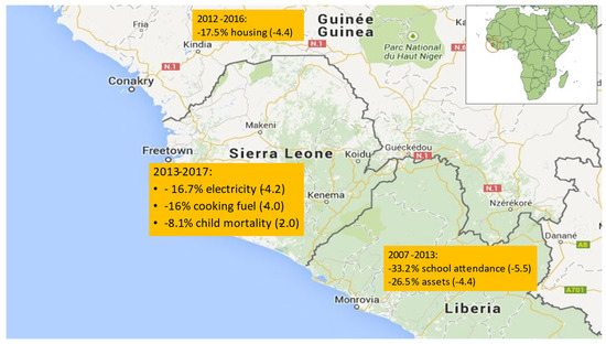 According to UNDP’s report “Global Poverty Index 2020” [15], Sierra Leone was the country where multidimensional poverty was cut down the most between 2013 and 2017, even during the Ebola epidemic. The poverty headcount reached 74% in 2013 and was only 58% in 2017 [16]. The reductions in poverty components of cooking fuel and access to electricity were the main indicators that explain Sierra Leone’s success. Even more, Sierra Leone ranked first among the all countries that could reduce poverty in the cooking fuel component (−16%) and child mortality (−86%). Liberia ranked first in the access to assets indicator (−26.5% between 2007–2013) and Guinea in the living conditions of housing (−17.5% between 2012–2016) (UNDP & OPHI 2020:12[15], Figure 8). For all these reasons, we believe that these three countries deserve an in-depth analysis (Figure 1).
