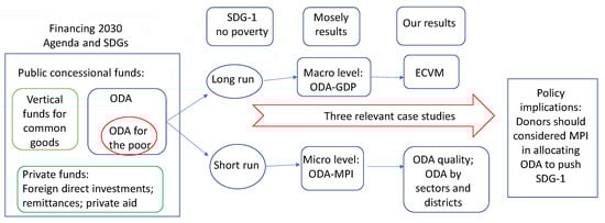 The political economy consequence of our results is that the analysis of the aid-growth nexus is not enough to state the effectiveness of foreign aid and its contribution to reach SDGs targets. A micro analysis based on disaggregated data is required15. Aid data based on geospatial allocation on ODA project and the poverty indicator that was intended to reduce, is necessary when the research question is whether ODA flows are linked to multidimensional poverty results at the country level16. The theory of change that underlies our framework can be seen in Figure 12.