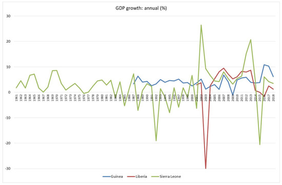 Guinea, Liberia and Sierra Leone are remarkably underrepresented among the research carried out for African countries5. All of them are Least Developed Countries6, they rank very low in the human development index7 and they shared the Ebola’s outbreak in the recent past (2013–2017). They share frontiers and they belong to the African Union since 2001, the Economic Community of West African States (ECOWAS) economic agreement8 since 1975, but trade among them is quite low. They are countries rich in natural resources. Guinea possesses the world’s largest reserves of bauxite and largest untapped high-grade iron ore reserves, as well as gold and diamonds. Liberia main exports are iron ore, rubber, diamonds and gold. Sierra Leone is rich in diamond mining, iron ore, rutile and bauxite. These countries also have high levels of ethnic and linguistic fragmentation. The three of them have shown remarkable economic growth rates since the beginning of the 21st Century.