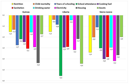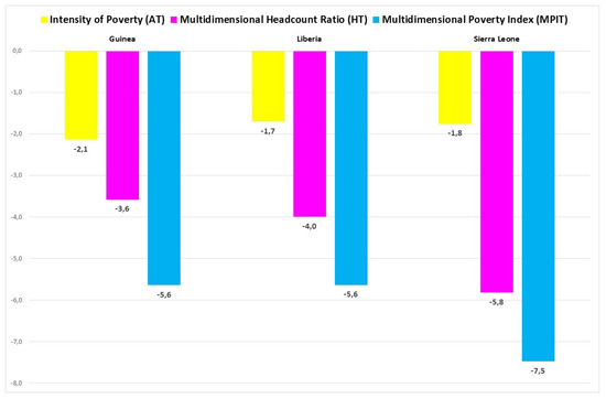 Reduction in the global MPI, and its headcount and intensity. Note: annualized relative changes in the Multidimensional Poverty Index harmonized for comparisons across time (MPIT). Time periods are: Guinea 2012–2016; Liberia 2007–2013; Sierra Leone 2013–2017. Source: Alkire et al. (2020) [16,29].