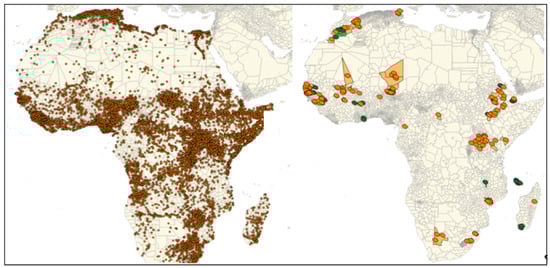 Figure 3 left panel depicts a map of the ACLED database conflict events in Africa since 1997. Many events are clustered in the population centers of the Nile River, coastal West Africa and Nigeria. Many conflict events also occurred in the vicinity of Rwanda, Burundi and Eastern Democratic Republic of the Congo. Figure 3 right panel highlights the tertiary administrative boundaries for districts with GEF land degradation projects in light orange where there is active conflict and in light green where there is no conflict. GEF land degradation project sites implemented within conflict-affected districts are marked with orange ovals and sites not near conflict are marked as green ovals. Figure 3 right panel also demonstrates the overlay analysis of GEF land degradation project locations and ACLED conflict events to identify the instances of co-location between GEF projects and active conflict. The co-location of projects and conflict is clearly visible in places like Mali, Niger, and Morocco.