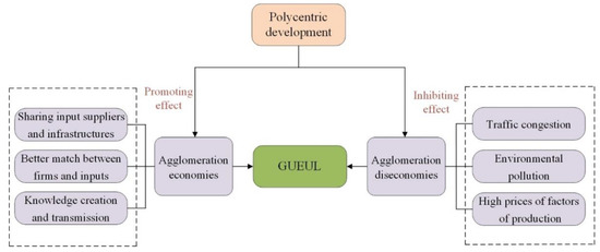 Polycentric development exerts effects on GUEUL by influencing the creation and accumulation of agglomeration effects, which are further categorized into agglomeration economies and diseconomies [20,23,30,36]. Sharing infrastructures and intermediate input suppliers, more efficient matches between enterprises and factors of production, and knowledge creation and transmission are the primary sources of agglomeration economies, and agglomeration economies positively affect resource utilization efficiency [37]. Agglomeration diseconomies (which take the forms of traffic congestion, environmental pollution, high prices of factors of production, etc.) tend to have a cost-raising effect and can thus adversely impact resource utilization efficiency [29,38,39]. Many scholars suggest that polycentric development contributes to the improvement of resource utilization efficiency, since it can not only promote an increase in agglomeration economies, but also facilitate a decrease in agglomeration diseconomies. However, there are also some researchers who argue that whether polycentric development can facilitate the accumulation of agglomeration economies is conditional on some other factors. The mechanism through which polycentric development affects GUEUL are demonstrated in Figure 1 and analyzed in detail in this section.