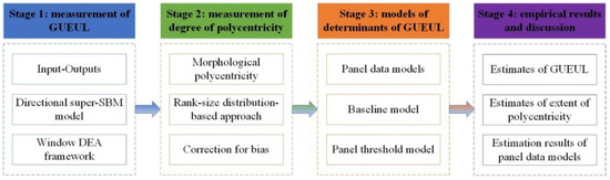 In this study, GUEUL is measured by employing the directional super-SBM model developed under the window DEA framework, and the extent of polycentricity is measured by employing the rank-size distribution-based approach. Linkage between polycentric development and GUEUL is then explored by estimating the models of determinants of GUEUL. In order to test the research hypotheses proposed earlier, both the baseline model and a panel threshold model are estimated. The research process of this study is demonstrated in Figure 2.