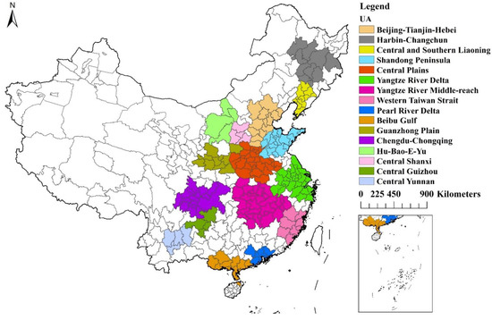 Development of UAs has been the main focus of China’s “new-type” urbanization which aims at achieving more sustainable and people-oriented urbanization [17]. Following existing studies [27], this research focuses on 16 major UAs in China which cover a total of 198 cities. These UAs are all stressed in “National Major Function-oriented Zone Planning” of China. The locations of the study area are demonstrated in Figure 3.
