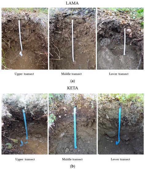 Soils of the upper, middle, and lower transects at the locality Lama (a) and Keta (b).