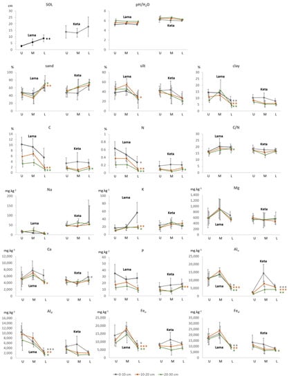 Changes of soil properties along the altitudinal gradient in different soil depths at the Lama and Keta localities (U–upper transect, M–middle transect, L–lower transect; vertical bars represent standard deviations). Significance of ANOVA F-tests: *** p < 0.001, ** p < 0.01, * p < 0.05.