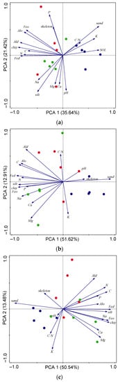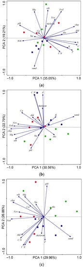 PCA analysis of soil properties in the depth of soil (a) 0–0.1 m, (b) 0.1–0.2 m, and (c) 0.2–0.3 m at the Lama locality. Color of points: blue–lower transect, green–middle transect, red–upper transect.