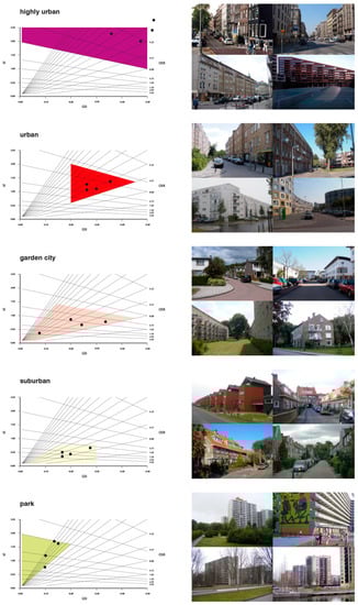 There is no shortage of studies in the literature on the relationship between the values of individual urban indexes and the form of development. There is a well-known example showing various typologies of buildings while maintaining the same intensity value [14,15]. Perhaps the best-known tool for presenting the density of an urbanized environment is the “spacemate” developed by Meta Berghauser Pont and Per Haupt at the beginning of the 21st century. [16,17,18]. Spacemate shows the building intensity and built-up area on one graph. Thanks to this, it is possible to observe the relationships between these indicators and the form of buildings. Different typologies of buildings will be located in different parts of the chart. The authors in their book [18] show different types of buildings depending on the value of urban indicators and name these forms (Figure 1). They describe the differences between them and indicate the forms ranging from the most urban, through typical quarters of urban development, development of garden cities, to suburban buildings of various densities. They also indicate typologies of buildings with low development intensity and a high number of stories, which break out of the hierarchy, which they call “park” typologies, due to the large open green areas between the buildings. The “park” typology is also present in Warsaw’s blocks of flats, mainly prefabricated ones, often called housing estates by town planners or simply “blocks” by residents.