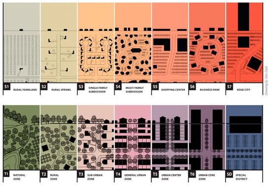 - Duany, A.; Talen, E. Transect Planning. J. Am. Plan. Assoc. 2002, 68, 245–266. [Google Scholar] [CrossRef]