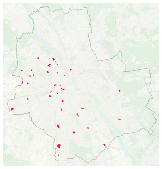 For the purpose of analyses, the spatial data was obtained mainly from the so-called “open sources” that are made available to users free of charge. The data on the buildings was obtained from the Land and Buildings Register (hereinafter referred to as EGiB) [45,46], which has attributes with information about the number of stories of individual buildings and also about their basic function. Data on land development functions, protected areas, street axes, and main public spaces come from the Open Street Map database (hereinafter OSM) [47], and the Database of Topographic Objects (hereinafter BDOT 10k) [48]. The relevant content layers from these two databases have been verified, cut and adjusted, so the input layers for the analyses are comprehensive and complete.