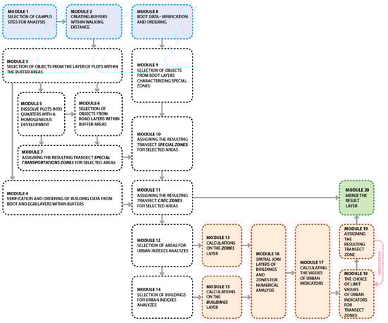 The first step in building the tool (Figure 5) in the ModelBuilder application in ArcGIS was to ask the question of what the output of this model is supposed to be. In the first part of the research, the result was to be the spatial layer with the quarters of buildings for which the values of urban indicators selected for these analyses will be calculated. These analyses, in order not to yield biased results, should be carried out with the exclusion of areas that do not represent typical transect zones. Therefore, modules 3–7 and 9–11 use appropriate geospatial tools on the verified, structured and adapted input layers (modules 1, 2, 8) to select the areas that belong to: