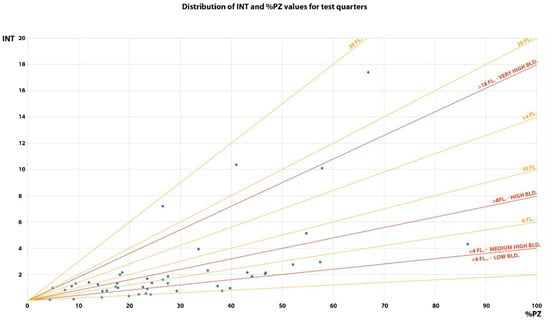 The indicator in the above form takes values in the range [0; 100]. The minimum value of the index occurs when there are no buildings or structures in the quarter. High values of the discussed parameter prove the considerable use of the area of the quarter for development. The maximum value—100—will occur relatively rarely and will indicate the full use of the quarter for development. In such situations, the built-up area equals the area of the quarter (PZ = PQ).