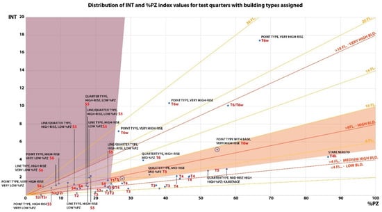 The ordinate axis (Figure 6) shows the values of the development density parameter, while the abscissa is the percentage of building coverage. This is the “spacemate” chart mentioned in chapter two [16,17,18]. It presents directly the values of these urban indexes for selected test quarters and enables the examination of the form of development indirectly in relation to the density of buildings. The individual areas on the chart correspond to different morphological types, thanks to which “spacemate” enables the comparison of selected quarters of buildings with a similar density of development, but with different typologies. In carrying out their research, Berghauser and Haupt revealed the relationship between urban features, i.e., higher surface area and building density parameters, and its form. Additionally, lines were drawn from point 0.0 showing the average weighted number of stories of buildings. The lines that divide buildings into height types adopted in the Polish construction law [50] are marked in red, namely: