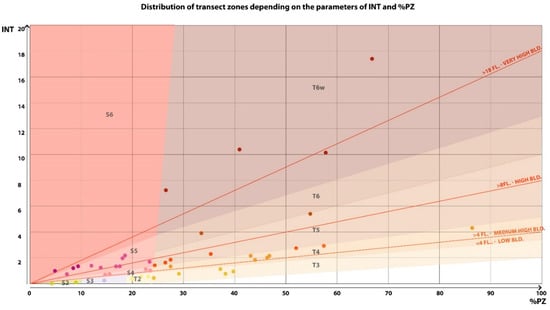 Zone T2 is a zone of extensive low-rise buildings, mainly consisting of single-family detached or semi-detached houses. Similar parameter values as the T2 zone will be demonstrated by buildings in the S2 zone—known as the habitat or loose development zone, in which typical residential buildings are mixed with the remaining habitats in the areas. The zones of this development are located on the outskirts of the city and over time they are gradually transformed into more intensively developed morphological zones. The zones with the lowest index are the natural green zones—T1 or the S1 zone—the utility green zone of allotments.