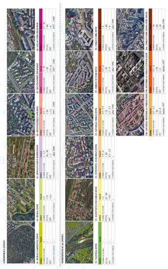 All the zones described above have been ranked and placed in the list of transect zones. This represents the results of module 18 from the algorithm in a graphic and understandable way, even for people who do not specialize in urban planning. For each zone, aerial photos are presented with an example of such a zone in the area of Warsaw with respective values of urban indexes characterizing the given zones (Figure 9). On this basis, it was possible not only to arrange the morphological types of buildings, but also to further the operation of the algorithm, and attempt to describe the city structure by breaking it down into transect zones.