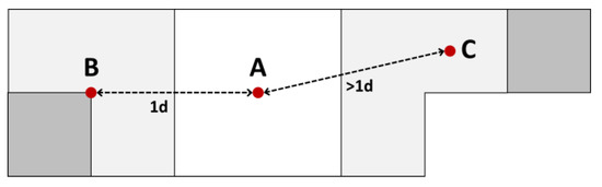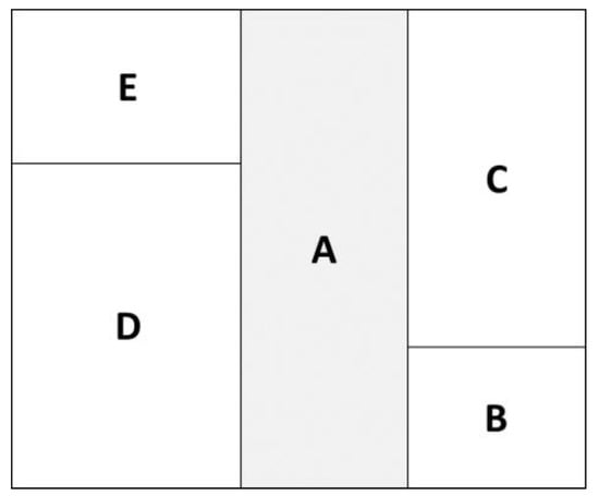 In addition to reshaping a system of land use types, it is essential to provide an appropriate, pre-defined spatial range before examining the functional compatibility of land use. There has not been a widely adopted criterion that assigns a geo-entity to such a parameter. Some scholars have developed guidelines drawing on the urban planning field to define the range. For example, based on the concept of the “15-minutes life circle of community” proposed by the Shanghai Government, Zhuo et al. have adopted 1500 meters as a spatial range [24]. Some other researchers drawing from demographics tend to use adjacency rather than a specific range as the spatial basis for demonstrating the influence between different geo-entities [26,40,41,42]. This concept has also been applied to define spatial range in some well-known geographical indices, such as Local Moran’s I [43] and Getis-Ord Gi* [44]. Focusing on measuring the interaction between different land uses, the paper at hand has adopted the adjacency approach to define a spatial range, particularly given the fact that the adjacency between different parcels represents critical geometric features to forming these interactions. More specifically, as shown in Figure 1, if parcel A is adjacent to parcels B, C, D, and E, then all those parcels can be considered within a spatial range influenced by parcel A.