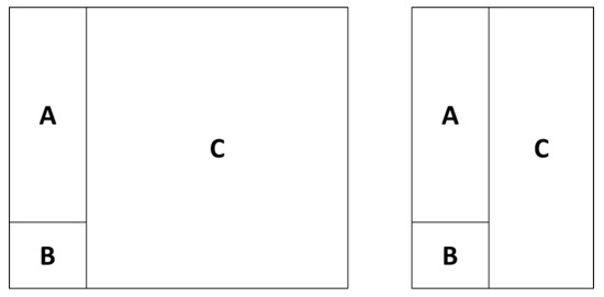 Explanation diagram of the geo-features on the length of shared boundaries and the area of adjacent parcels, adapted from the study of Kennedy and Tobler [40]. Assume that the influencing components are evenly distributed in A, B, and C so that C has the most influencing components, while A and B rank 2 and 3, respectively. Given this background, the C influencing components will more easily cross the boundary between C and A than C and B according to the left diagram, as the length of the common boundary between C and A is higher. Similarly, comparing the two diagrams, we can see that C influencing components on the left are obviously greater than C on the right, and thereby the inter influence degree between A and C is larger on the left than on the right.