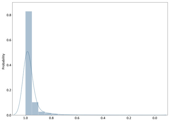 Table 3 presents a summary of the descriptive statistics associated with compatibility. Similarly, Figure 6 demonstrates the probability distribution of FCDI with the majority of values falling between [0.9, 1] while the theoretical range is [0, 1]. Such a distribution, on the one hand, indicates that the compatibility of most land parcels in Xiangtan remain at a relatively positive level. On the other hand, it points to the fact that the distribution follows a heavy-tailed one. According to Scripter and Jiang [49,50], to partition and visualize the data using traditional ways, such as Nature Jenks or quantiles, is somewhat inappropriate, as these methods do not provide a clear representation of the data in the long tail. Thus, a new classification, head-tail breaks proposed by Jiang is adopted for providing a greater precision of the targeted data. By implementing the new method, this study has created eight partitioning thresholds and divided all the parcels’ FCDI values into seven classes. Details are demonstrated in Figure 6 and Table 3.