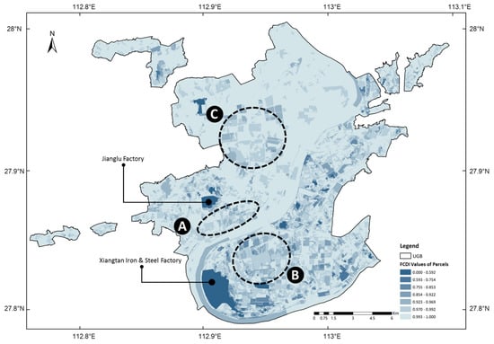 The spatial distribution pattern of FCDI values of parcels in the study area.